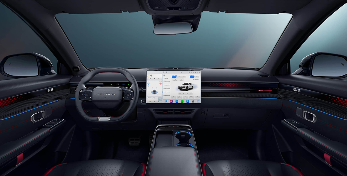 Палитра кузова включает 5 цветовых решений: «Галактический черный», «Лунный белый», «Шелковый красный», «Ванильный голубой» и «Призрачный серый». При этом Jetour предлагает клиентам два варианта цветового исполнения салона: красно-черный и серо-белый.